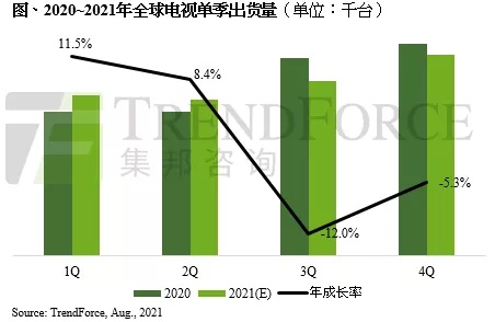 虽然第三季进入传统旺季促销的备货顶峰,但本年运送时刻因港口阻塞问题从而导致终端上架时刻拖延3~4周,直接紧缩品牌在欧美地区的备货量。因为整机本钱上涨、运送时刻拉长,旺季促销规划将遭到按捺。因而,TrendForce集邦咨询预估,2021年下半年电视出货将年减8.5%,达1.17亿台。