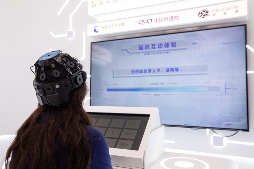 戴上特制头盔,就能够辨认脑电波波形特征,体会脑纹核身。在展区,记者体会了全球首个脑机头戴核身技能互动,这是由蚂蚁安全实验室联合信通院、脑机协作出产厂商博瑞康一起推出的最新技能。这一技能完结根据脑电波辨认波形特征的身份辨认,也是为未来穿戴设备场景下的身份辨认做的技能储备。