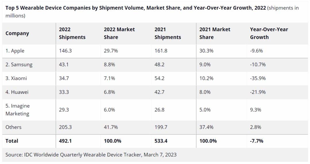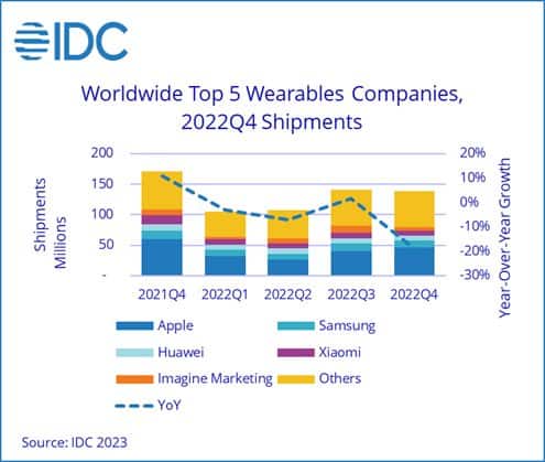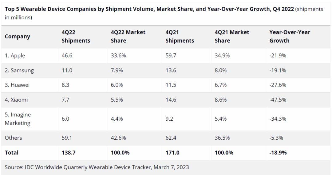 依据IDC最近发布的全球季度可穿戴设备盯梢陈述,2022年第四季度全球可穿戴设备出货量同比下降18.9%,降至约1.4亿台。在严峻的微观经济形势下,2022年全年出货量与2021年相比下降了7.7%,与2021年的微弱成绩难以比较,这是该品类出货量的首年下降。虽然经济低迷,但2022年的全体出货量仍达到了4.9亿台,远高于2020年和2019年的水平。